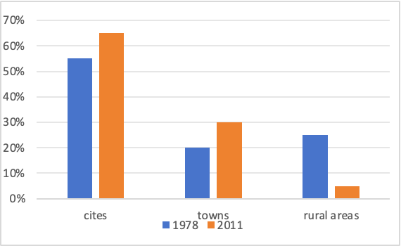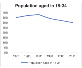 线图描述了一个国家18岁到34岁的人数占比从1978到2011这33年的变化;柱状图描述了从一个时间段这个年龄段的人住在cities, towns, and rural areas的占比。
