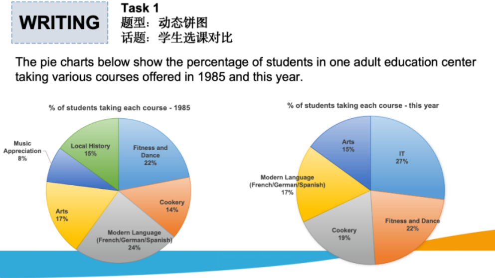 The pie charts illustrate the changes in the percentage of students enrolled in various courses at an adult education center in 1985 and this year.